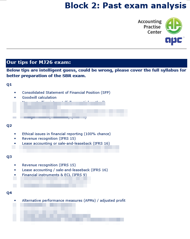 With less than 200 pages, we go through huge amount of past exam questions, with our solutions, 100% aligning with study hub text, with heavy focus on 'strategic application' of SBR knowledge.